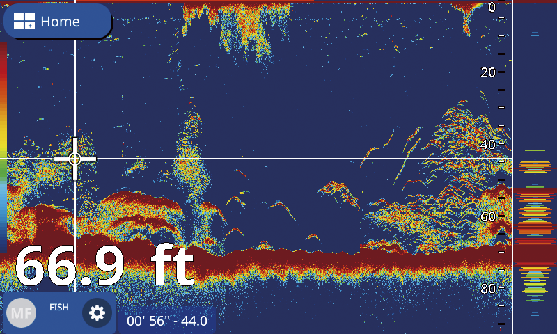 GP-1871F/1971F sono equipaggiati di serie con mudulo ecoscandaglio TrueEcho CHIRPTM a banda singola (40 -225 kHz) con potenza 300W/600W/1kW. Questo tipo di tecnologia consente una visuallizzazione degli echi maggiormente dettagliata come si puo vedere dall’esempio qui sotto. E’ possibile utilizzare in alternativa al trasduttore CHIRP, la sonda tradizionale a doppia frequenza 50 e 200 kHz da 600W/1 Kw beneficiando della tecnologia proprietaria Furuno RezBoostTM. Questa opzione è valida per coloro che, avendo già a bordo un apparato Furuno di ultima generazione, vogliono mantenere la sonda esistente. Inoltre in questo caso è possibile usufruire sia della funzione ACCU-FISHTM, misura dimensione dei pesci, che BDS, discriminazione tipologia di fondale, introdotta da tempo nella gamma di ecoscandagli e chart plotter Furuno (verificare compatibilità sonda con funzione ACCU-FISH e BSD)