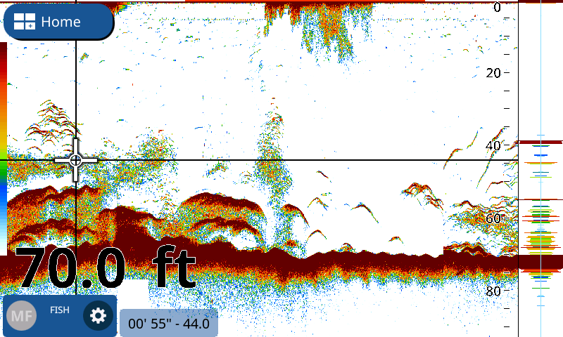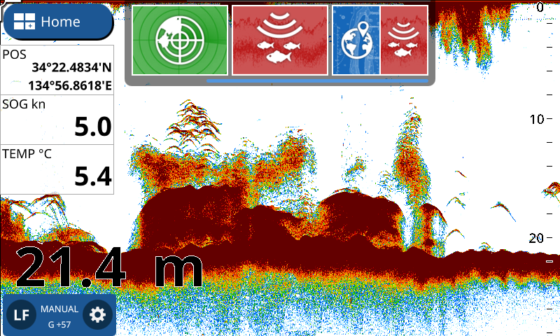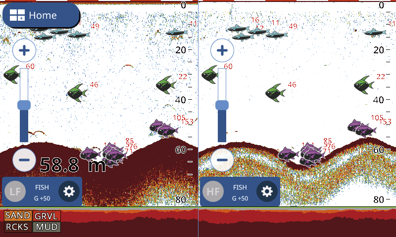 GP-1871F/1971F sono equipaggiati di serie con mudulo ecoscandaglio TrueEcho CHIRPTM a banda singola (40 -225 kHz) con potenza 300W/600W/1kW. Questo tipo di tecnologia consente una visuallizzazione degli echi maggiormente dettagliata come si puo vedere dall’esempio qui sotto. E’ possibile utilizzare in alternativa al trasduttore CHIRP, la sonda tradizionale a doppia frequenza 50 e 200 kHz da 600W/1 Kw beneficiando della tecnologia proprietaria Furuno RezBoostTM. Questa opzione è valida per coloro che, avendo già a bordo un apparato Furuno di ultima generazione, vogliono mantenere la sonda esistente. Inoltre in questo caso è possibile usufruire sia della funzione ACCU-FISHTM, misura dimensione dei pesci, che BDS, discriminazione tipologia di fondale, introdotta da tempo nella gamma di ecoscandagli e chart plotter Furuno (verificare compatibilità sonda con funzione ACCU-FISH e BSD)